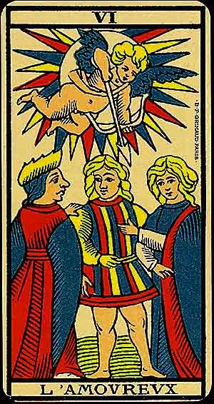 The Lovers card depicts a man standing between two women, with Cupid above aiming an arrow. The scene suggests a choice or a union, with the women often representing opposing influences. In some interpretations, the figures are Adam and Eve, symbolising the duality of earthly and spiritual love.