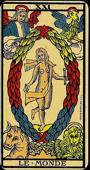 A dancing figure surrounded by a wreath occupies the center, representing completion and harmony. The four corners of the card feature symbols of the elements or the four cherubs, signifying unity. The figure holds wands or batons, symbolising mastery and balance.