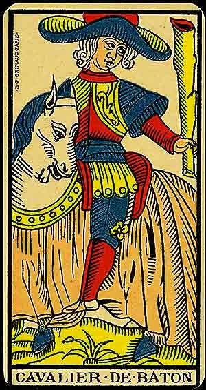The Cavalier of Batons is depicted riding a spirited horse, holding a baton firmly, symbolising action, ambition, and forward movement. The dynamic imagery reflects themes of adventure, determination, and the drive to pursue goals with passion.