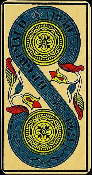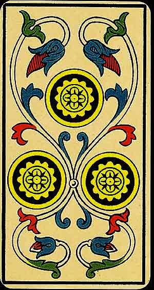 Three coins are arranged in a triangular pattern, accompanied by simple yet elegant ornamentation, symbolising craftsmanship and collaboration. This card evokes themes of skilful creation, teamwork, and steady progress.